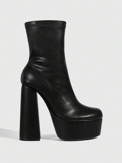 CUCCOO SZL Women's Black Square Toe Chunky Heel Waterproof Platform Elastic Minimalist Style Party Side Zipper Ankle Boots For Christmas Spring Shoes