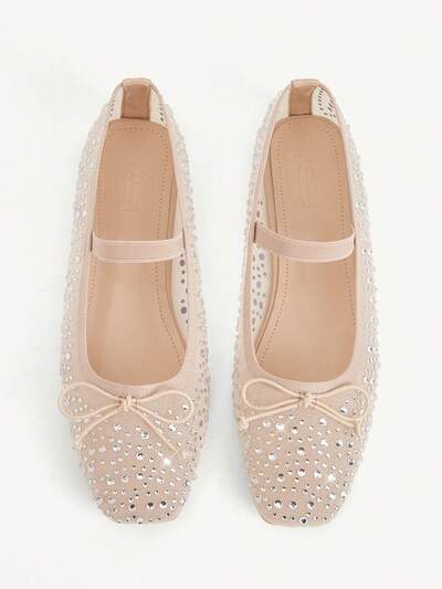 CUCCOO CHICEST Women Shoes Spring And Summer Fashion Apricot Full Diamond Mesh Yarn Small Bow Elastic Band Women's Flat Shoes Elegant Comfortable Breathable Cute Sweet Mary Jane Flat Women's Shoes