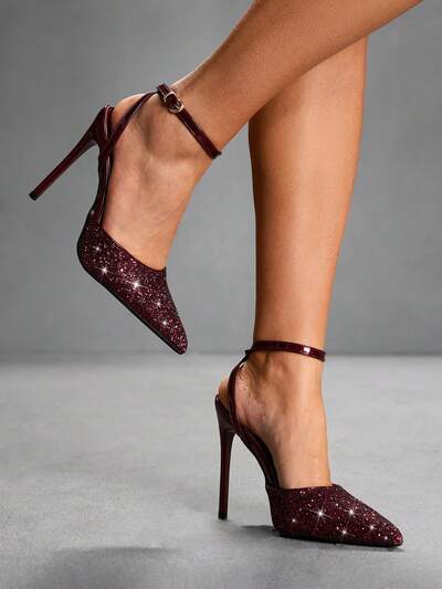 CUCCOO SZL Women Shoes Pointed Thin High Heel Burgundy Glitter Ankle Strap Slingback Women's Shoes Simple Elegant Fashion Sexy Party Banquet Nightclub Women's High Heel Shoes Women's Shoes Spring Shoes