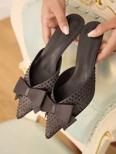 CUCCOO HITCHD Women's Autumn/Winter New Sparkling Crystal Bow Pointed Toe Kitten Heel Elegant Luxurious Romantic Sexy Burgundy Satin High Heel Mules Dress Shoes, Bridal Wedding Guest Party Formal Occasion For Christmas Wedding Shoes Summer Shoes Bride Shoes
