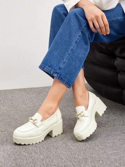 CUCCOO BIZCHIC Women Metal Decor Platform Shoes, Preppy Beige Platform Loafers For Outdoor Vacation Shoes Summer Elegant Basics Business Casual Business Chic Spring Shoes Spring Break Easter For Christmas Spring Shoes