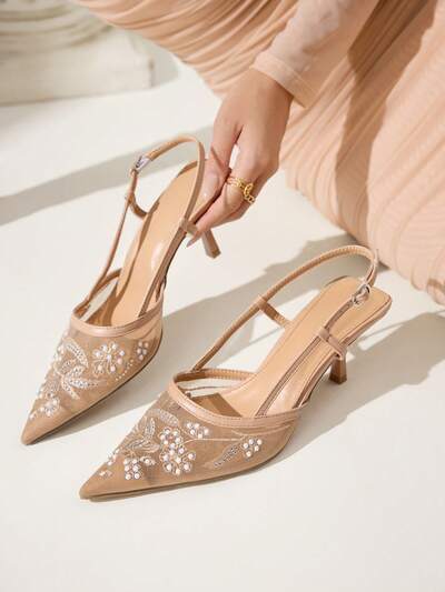 CUCCOO CHICEST Women's Fashion Pointed Toe Apricot Embroidered Mesh Dress Sandals With Back Strap, Thin High Heel Wedding Party Pumps For Christmas Elegant Shoes Wedding Shoes Summer Shoes Bride Shoes