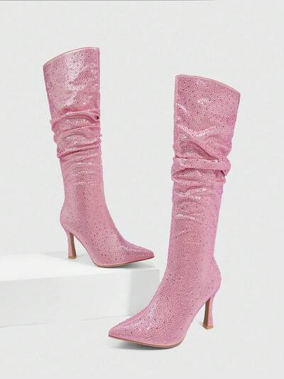 CUCCOO SZL Women's Pointed Toe Rhinestone Embellished Ruched Tall Boots, Sexy High Heel Party Knee-High Boots For Christmas Spring Shoes