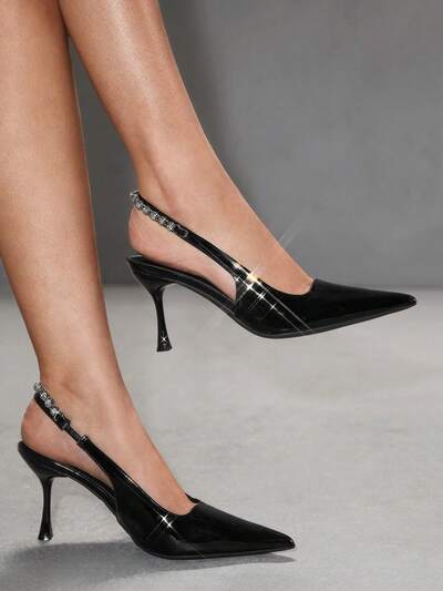 CUCCOO SZL Women's Black Patent Leather Pointed Toe Stiletto Heel Backless Rhinestone Decor Ankle Strap Sexy Party High Heel Pumps Valentine's Day