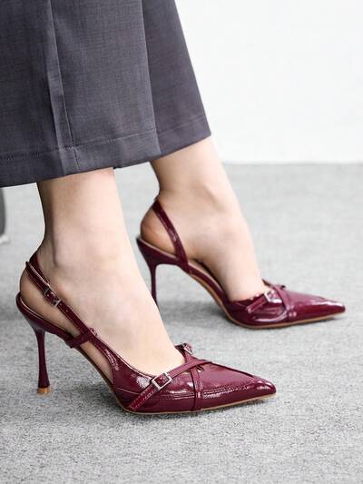 CUCCOO CHICEST Women Shoes Spring And Summer. New Pointed X Thin Heel High Heel Romantic Elegant Burgundy With Rhinestone Love Buckle Women's High Heel Shoes Dress Shoes Bridal Shoes Wine Season Collection For Valentine's Day Elegant Versatile Valentine's Day Elegant Shoes Wedding Shoes