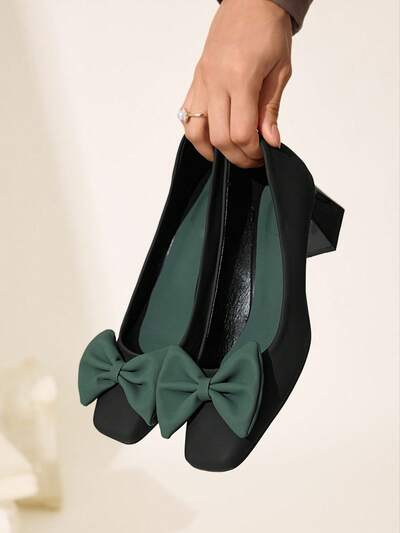 CUCCOO CHICEST Women's Elegant Bowknot Square Toe Block Heel Mid-Heel Pumps, Comfortable Commuting Romantic Classic Black Green Contrast Color Satin Ladies High Heels, Suitable For Formal Dress, Afternoon Tea, Date, Party, Workplace, Versatile, Academic Style, Back To School, Halloween, Christmas, Thanksgiving, St. Patrick's Day