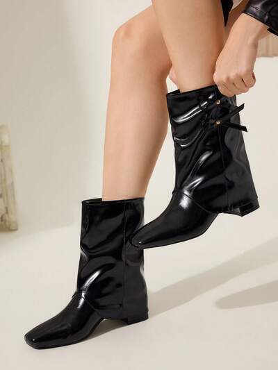 CUCCOO CHICEST Women's Autumn/Winter New Arrival Metal Bow Square Toe Block Heel Elegant Sweet Commute Casual Fashion Personalized Comfortable Black Faux Leather Patent Leather Ankle Boots, Suitable For Afternoon Tea, Date, Fashion Party, Workplace, Collegiate, Streetwear,, Basic Versatile, Christmas, Thanksgiving, New Year