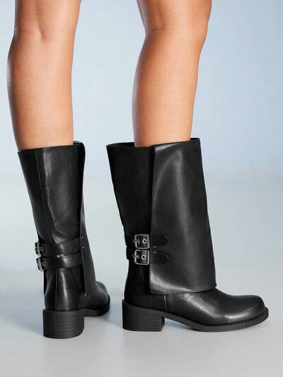 CUCCOO CHICEST Women's Buckle Design Pointed Toe Chunky Heel Mid-Calf Boots, Fashionable For Daily Wear