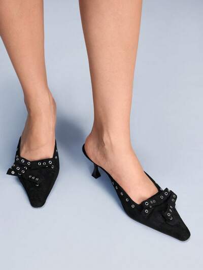 CUCCOO GRLICON Women's Pointed Toe Low Vamp Sexy Bow Knot Metal Rivet Chunky Heel Sandals