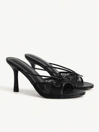 CUCCOO CHICEST Women's Black PU Mesh Patchwork Sandals, Bowknot Strap Round Toe Stiletto High Heels, Elegant Romantic Suitable For Afternoon Tea, Date, Formal Dress, And Holiday For Christmas Elegant Shoes Wedding Shoes Summer Shoes Bride Shoes