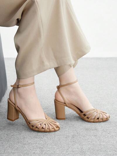 CUCCOO BIZCHIC Women's Peep Toe Chunky Heel Buckle Decor Hollow Weave Elegant High Heel Sandals, Apricot Color For Christmas Spring Shoes-32%