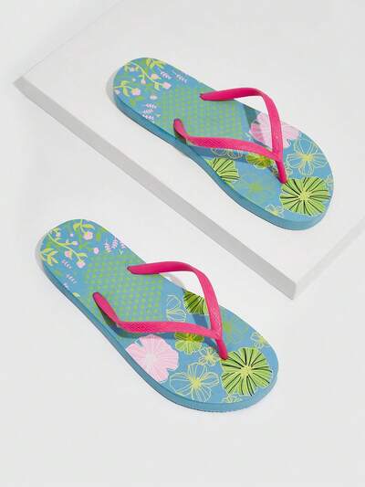 Woman Shoes Floral Pattern Toe Post Flip-Flops, Fashion Outdoor PVC Flip Flops For Summer Vacation Shoes Summer New Year Holiday For Casual Beach Style For Christmas Beach Outfit Flip Flops