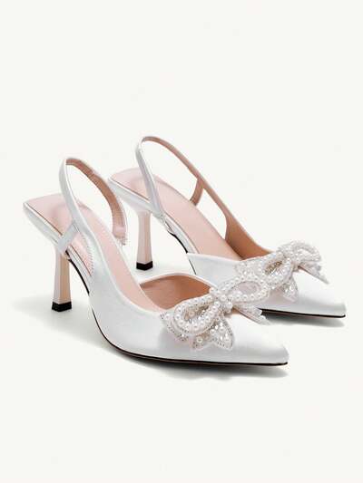 CUCCOO CHICEST Women's Pointed-Toe Stiletto High Heels, Faux Pearl & Rhinestone Bow Decor, Elegant Formal Party Wedding Guest Dress Shoes, White For Christmas Elegant Shoes Wedding Shoes Summer Shoes Bride Shoes