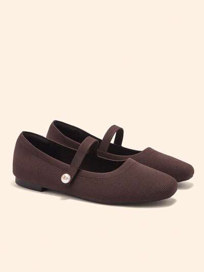 CUCCOO BASICS Women's Fashion Coffee Color Knitted Round Toe Strap Faux Pearl Mary Jane Flats, Comfortable Breathable For Commuting, Party, Shopping, Vacation For Christmas Spring Shoes