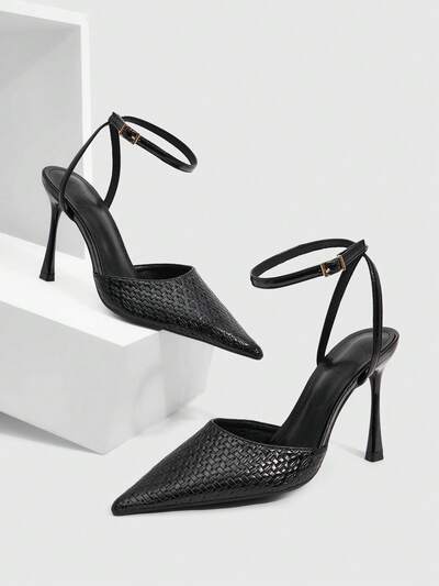 CUCCOO SZL Women's Black Pointed Toe Stiletto High Heel Sexy Evening Party Ladies High Heel Pumps With Ankle Strap And Backless Design Spring Shoes