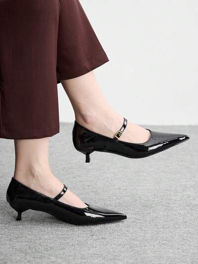 CUCCOO BIZCHIC Women's Black Patent Leather Pointed Toe Metal Buckle Commuting Versatile Fashion High Heels Spring Shoes