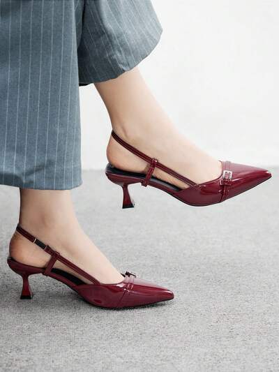 CUCCOO BIZCHIC Pointed Toe Kitten Heel Fashion Burgundy Daily Versatile Commute Women's High Heel Pumps With Ankle Strap, Suitable For Work, Shopping, Office For Christmas Spring Shoes
