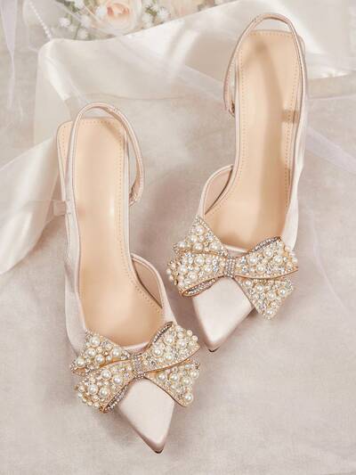 CUCCOO TILAWA Women's Faux Pearl Bow Decor Pointed Toe Slingback Thick High Heel Closed Toe Pumps, Elegant For Daily, Commuter, Party, Wedding, Formal Occasions. Suitable For Spring & Summer, Silver PU Spring Shoes Spring Break Easter Prom Heels For Christmas
