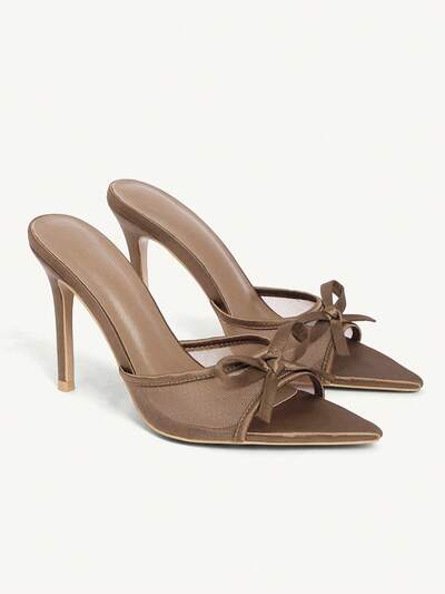 CUCCOO CHICEST Women Shoes Brown Satin Mesh Splicing Summer And Summer Bow Elements Fashion Sexy Pointed Stiletto Slippers Summer Shoes Wedding Shoes Bride Shoes