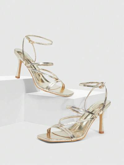 CUCCOO SZL Women Shoes Silver New Heel With Round Toe Rhinestone Design, Elegant, Sweet And Romantic; Metal Leather Women's High Heels Sandals, Footwear, Dress Shoes, Afternoon Tea, Dating, Fashion Parties, Workplace Wear, Elegant Dress, Versatile Models, Suitable For Halloween Prom Heels Summer Shoes