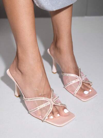 CUCCOO SZL Women's Fashion Square Toe Thin High Heel Pink Mesh Rhinestone Chain Open Toe High Heel Sandals, One-Piece Slip-On Sandals, Stylish Glamorous Sexy Party Sandals Spring Shoes