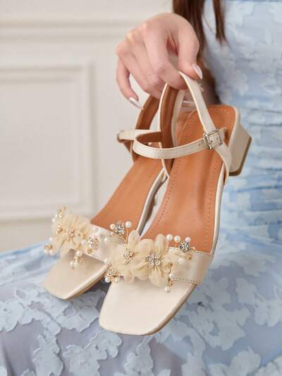 CUCCOO HITCHD Women Shoes Spring And Summer Decal Rhinestone Faux Pearl Element Square Toe 4CM Coarse Heel Fashion Style Apricot Satin Fabric Coarse Heel Sandals Wedding Valentine's Day Wear Wedding Shoes Spring Shoes Bride Shoes