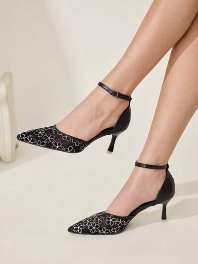 CUCCOO CHICEST Spring And Autumn Black Mesh Embroidery Pointed Tip Thin Heel Sexy Elegant Hollow Women's High Heel Shoes Wedding Shoes Spring Shoes Bride Shoes