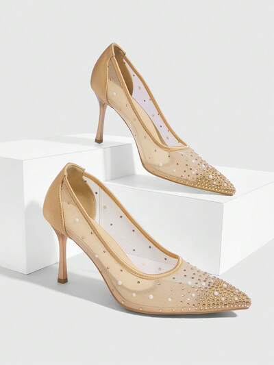 CUCCOO SZL Women's Fashion Pointed Crystal/Rhinestone Gold Powder Mesh Stitching Party Dinner Stiletto High Heels Shoes