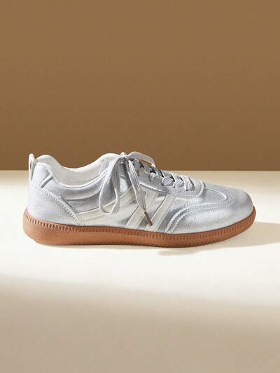 CUCCOO EASI Breathable Retro Moral Training Shoes For Women, Silver And White Stripes, Non-Slip Raw Rubber Outsole, Light Soft Sole, Daily Shopping Commuter Shoes