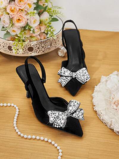 CUCCOO HITCHD Women's Pointed Toe High Heel Shoes, Spring/Summer New Arrival, Faux Suede Fabric, Rhinestone & Pearl Bow Decor, Comfortable & Elegant, Suitable For Weddings, Parties, Formal Occasions