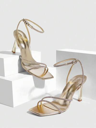 CUCCOO SZL Women Shoes Spring And Summer New Golden Rhinestone Belt Ankle Strap Women's High Heel Sandals Simple Fashion Comfortable Versatile Sexy Party Banquet Women's Sandals Women's Shoes Prom Heels Summer Shoes