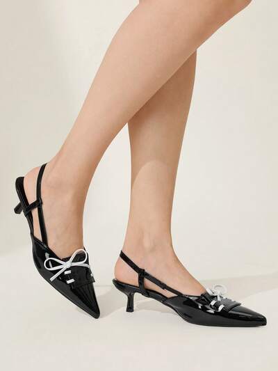 CUCCOO CHICEST Women Shoes Black Patent Leather Pointed Thick Heel Slingback Shoes, Big Bow Decorative Women's Shoes, Elegant Commuting Versatile Shoes