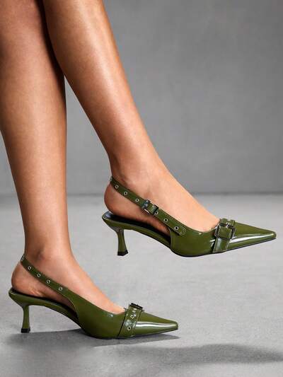 CUCCOO SZL 1 Pair Olive Green Pointed Toe Stiletto Buckle Strap High Heel Sandals, Chic And Mature Style, With Metal Buckle And Adjustable Strap, Suitable For Young Women To Wear To Work Or Dates