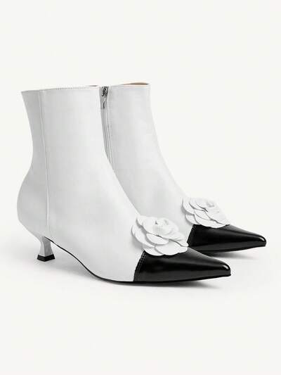 CUCCOO CHICEST Zapatos de vestir de mujer para otoño/invierno con nuevas flores de camelias, puntera puntiaguda, tacón de gatito, elegantes, dulces, para ir al trabajo, románticos, vintage, clásicos, de piel sintética negra y blanca, botas de tobillo, adecuados para tomar el té por la tarde, citas, fiestas de moda, el lugar de trabajo, atuendos elegantes, galas, Halloween, Navidad, Acción de Gracias