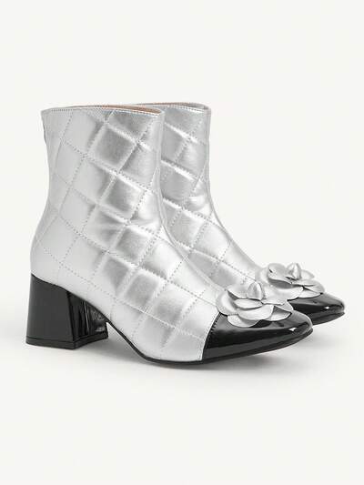 CUCCOO CHICEST Nuevos Llegados de Otoño/Invierno para Mujer - Zapatos de Vestir con Tacón Cuadrado Grueso y Puntera Redonda, Diseño de Flores 3D, Camelias, Bloques de Color, Elegantes, Dulces, Románticos, de Moda, Clásicos, Cómodos, Retro en Negro, Plata, Bloque de Color, Cuero Patentado, Imitación de Cuero Metálico, Botines de Moda, Botas hasta el Tobillo, Botas hasta la Pantorrilla, para Tomar el Té, Citas, Fiestas de Moda, Ropa de Trabajo, Elegantes, Lolita, Halloween, Navidad, Acción de Gracias