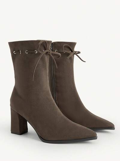 CUCCOO CHICEST Botas de tacón grueso de media pantorrilla con punta puntiaguda para mujer, diseño de cordones con lazo, estilo elegante y versátil para ir a trabajar, citas, tomar el té por la tarde, Navidad y primavera, en ante sintético marrón y verde