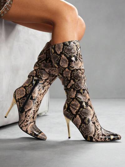 CUCCOO SZL Botas de moda de tacón alto con puntera puntiaguda y patrón de piel de serpiente fruncida para mujeres para Navidad