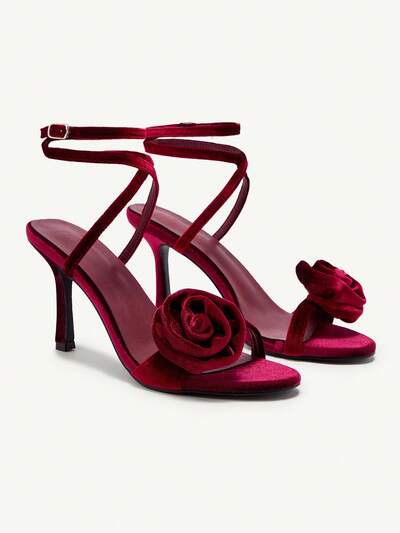 CUCCOO CHICEST Sandalias de tacón alto de stiletto con punta afilada, adornadas con flores de color burdeos, elegantes y sensuales, con correa de tobillo de terciopelo, ideales para fiestas, citas, pasarela y ocasiones formales, incluyendo el Día de San Valentín