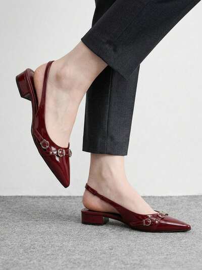 CUCCOO BIZCHIC Zapatos de mujer de tacón grueso con punta, hebilla burdeos, elegantes y sexy, versátiles para uso diario, fiestas y eventos, zapatos planos de mujer con correa trasera