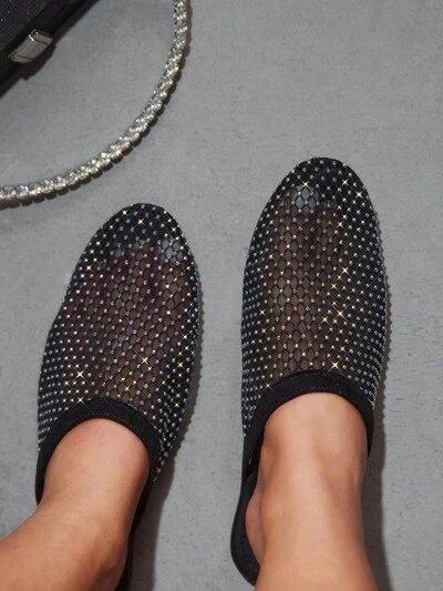 CUCCOO CHICEST Zapatos de mujer de primavera y verano, moda, plata, malla con diamantes completos, zapatos planos elásticos de mujer tipo mula, elegantes cuando son cómodos, lindos y dulces zapatos planos de mujer, medias zapatillas