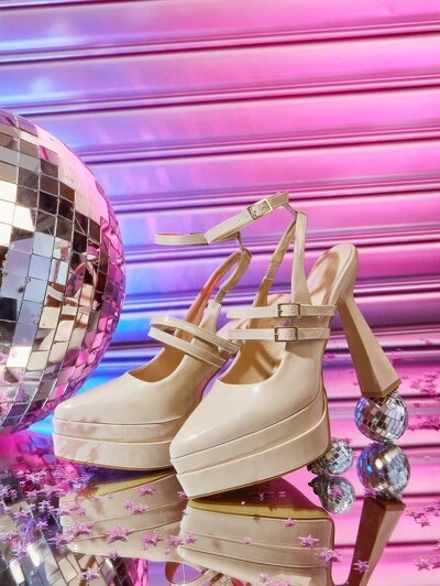 CUCCOO LuxiPop Tacones de plataforma altos con correa y punta puntiaguda, color champán, adecuados para disfraces de Halloween, Navidad y fiestas de Año Nuevo