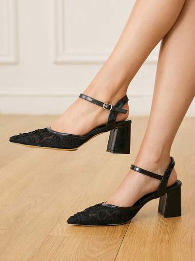 CUCCOO HITCHD Zapatos de mujer para primavera. Nuevos zapatos de tacón alto con punta gruesa, románticos y elegantes, de malla negra con flores. Zapatos de tacón alto para vestir, zapatos de novia, colección de temporada de vino para el Día de San Valentín, elegantes y versátiles