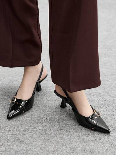 CUCCOO BIZCHIC Tacones altos de moda con puntera puntiaguda, de piel patentada negra, con nueva hebilla metálica y correa de tobillo, sin talón, para uso diario, casual y de citas
