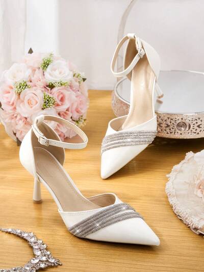 CUCCOO HITCHD Zapatos de tacón alto con punta puntiaguda, con falso perla blanca, flor de encaje y correa trasera para mujer. Zapatos de novia, fiesta de boda y noche. Tacones sin talón, zapatos elegantes para boda