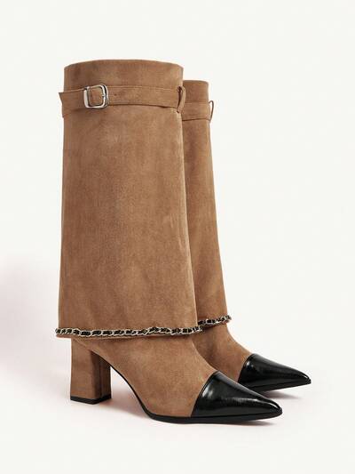 CUCCOO CHICEST Botas de gamuza y piel sintética con tacón cuadrado grueso de color en bloque, puntera puntiaguda, hebilla de cadena, elegantes y románticas, cómodas y retro, en color negro y camello, adecuadas para el té de la tarde, citas, fiestas de moda, el trabajo, elegantes, ropa urbana, uso versátil básico, Navidad, Acción de Gracias, Año Nuevo, Festival de Primavera