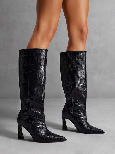 CUCCOO SZL Botas de tacón de aguja con punta puntiaguda y caña ancha con estampado de cocodrilo negro de moda para mujer, para Halloween, primavera, vacaciones de primavera, Pascua y Navidad