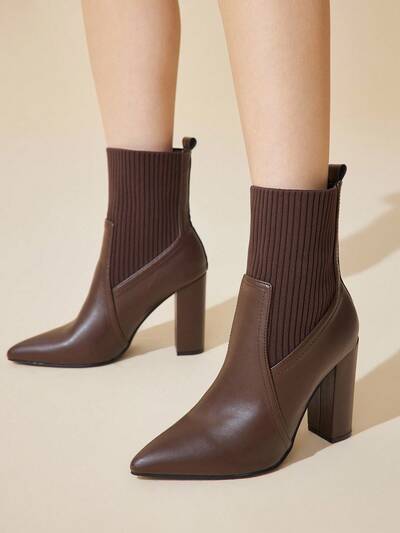 CUCCOO BASICS Botas de tacón grueso de punta afilada de color café para mujer, elegantes y minimalistas para uso diario y versátiles, ideales para el commuting y la Navidad, de media pantorrilla y tobillo de punto