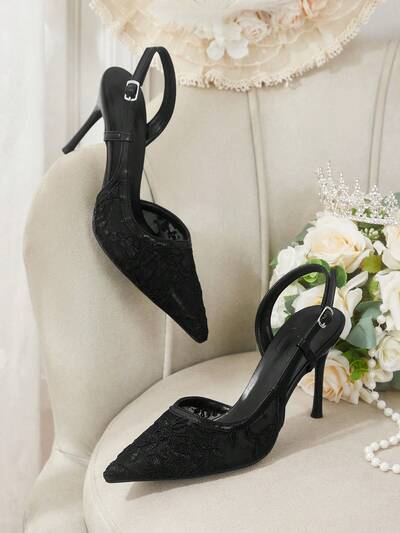 CUCCOO HITCHD Zapatos de mujer de tacón fino y puntiagudo, de malla negra con encaje, sencillos y con tira trasera. Zapatos de tira trasera para mujer, ideales para bodas, fiestas y banquetes. Zapatos de tacón alto sencillos y elegantes para mujer.