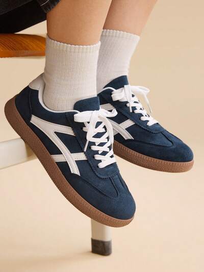 CUCCOO EASI Baskets de gym décontractées pour femmes, de couleur unie contrastée et style preppy. Chaussures plates décontractées à lacets en patchwork marron. Chaussures de sport rétro mode pour l'extérieur et la course.