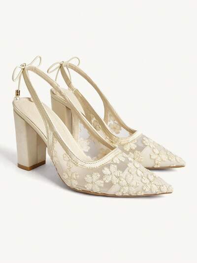 CUCCOO CHICEST Women's Elegant Versatile Comfortable Black Mesh & Lace Pointed Toe Low Block Heel Slingback Flats For Christmas Elegant Shoes Wedding Shoes Summer Shoes Bride Shoes